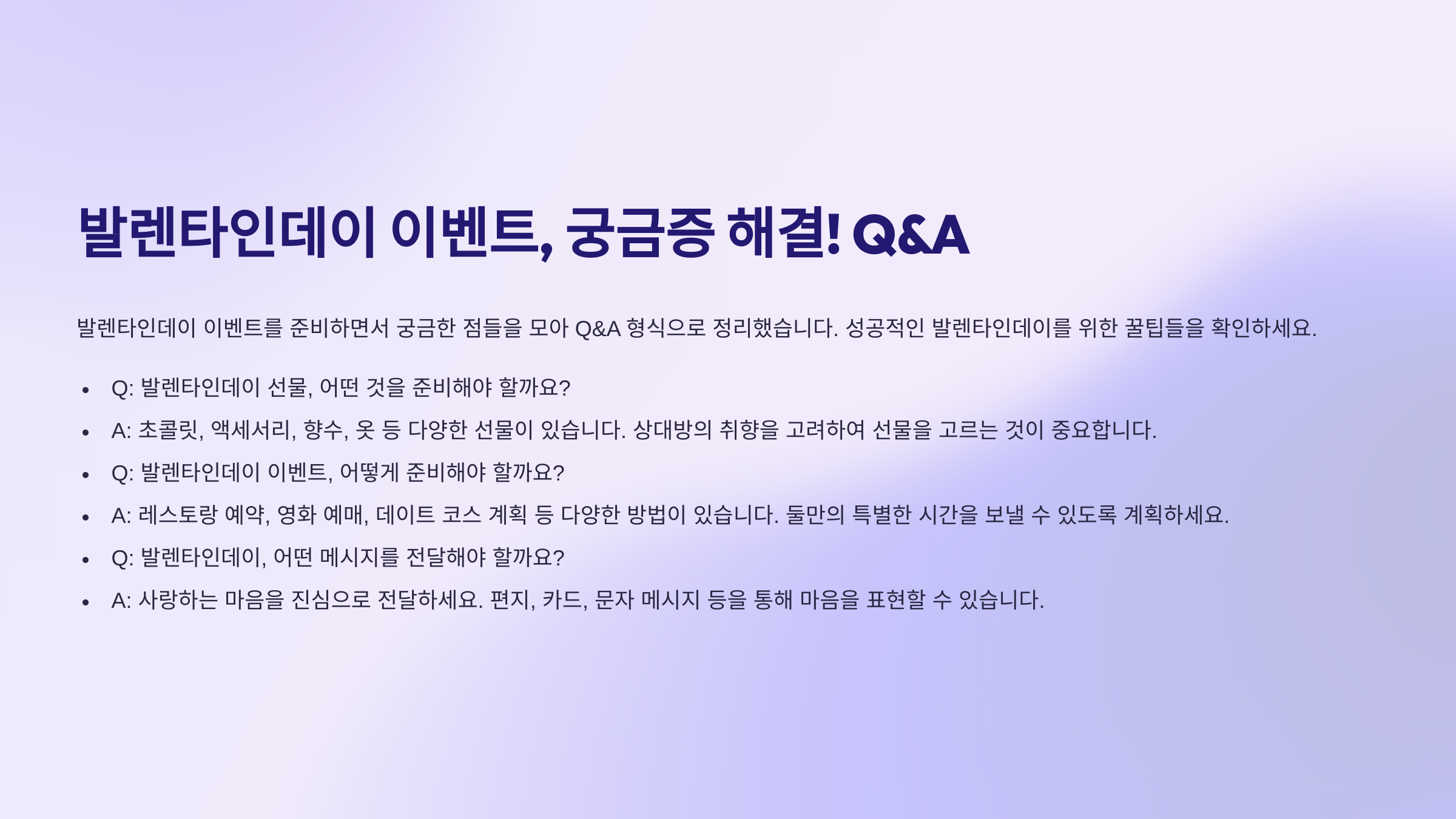 선물도 중요하지만, 어떻게 연출하느냐에 따라 감동의 크기가 달라져요. 발렌타인데이를 더욱 특별하게 만들 수 있는 연출 노하우를 소개할게요! 🎬
