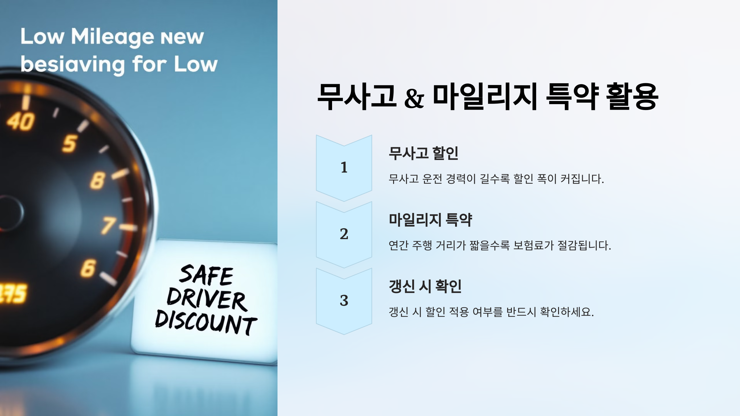 자동차보험료를 줄이는 가장 확실한 방법 중 하나는 **무사고 할인**과 **마일리지 특약**을 활용하는 것이에요. 운전을 조심히 하고 연간 주행거리를 관리하면 보험료를 최대 40%까지 절약할 수 있답니다.