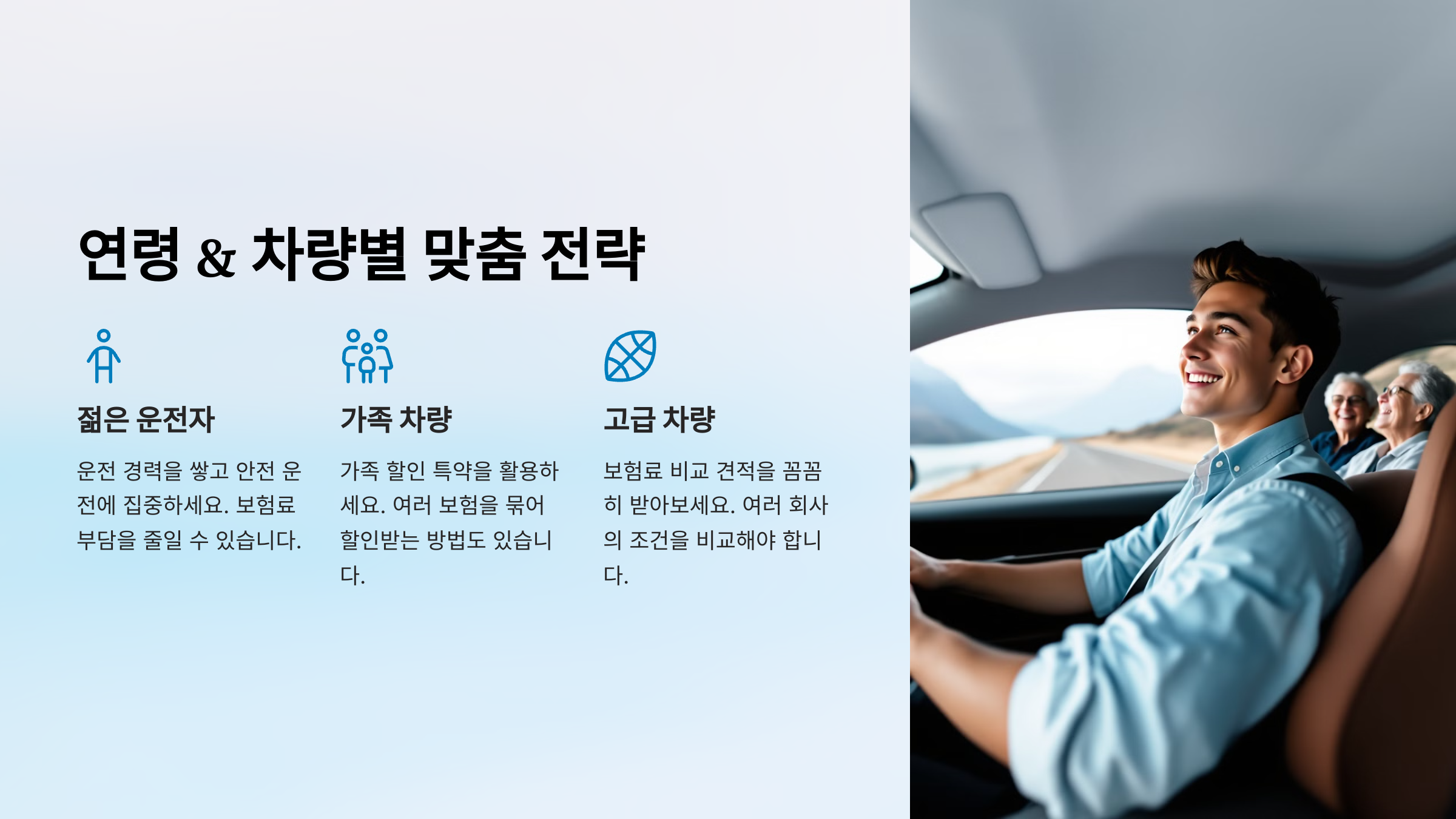 보험료를 아끼는 방법은 연령대와 차량 조건에 따라 다양해요. 본인에게 맞는 전략을 활용해 합리적으로 보험료를 절약해 보세요! 🚘💡