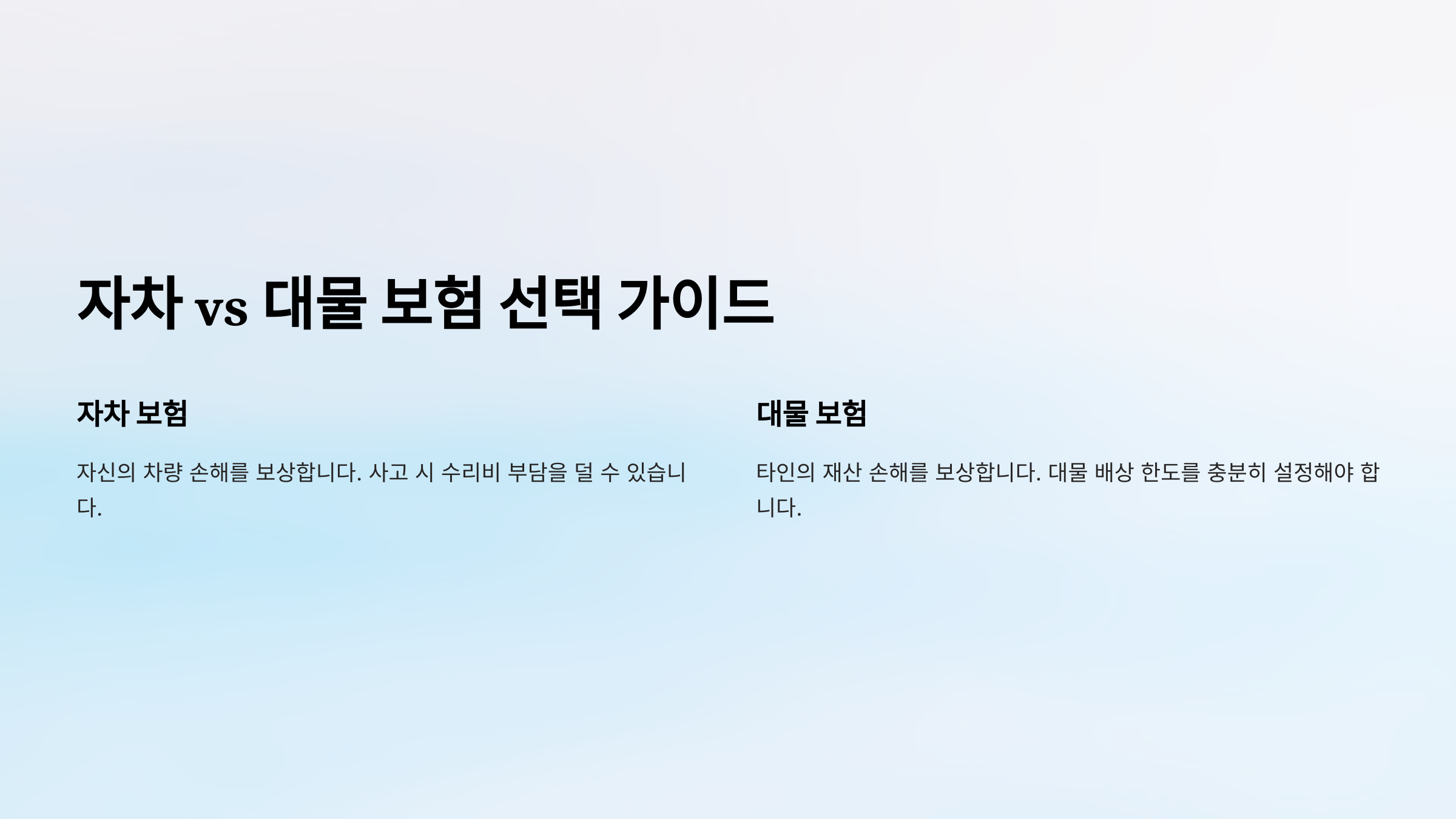 자동차보험을 가입할 때 가장 고민되는 부분이 자차 보험과 대물 보험이에요. 어떤 보장을 선택하느냐에 따라 보험료가 크게 달라질 수 있기 때문에, 내 차량과 운전 습관에 맞는 최적의 선택을 하는 것이 중요해요.