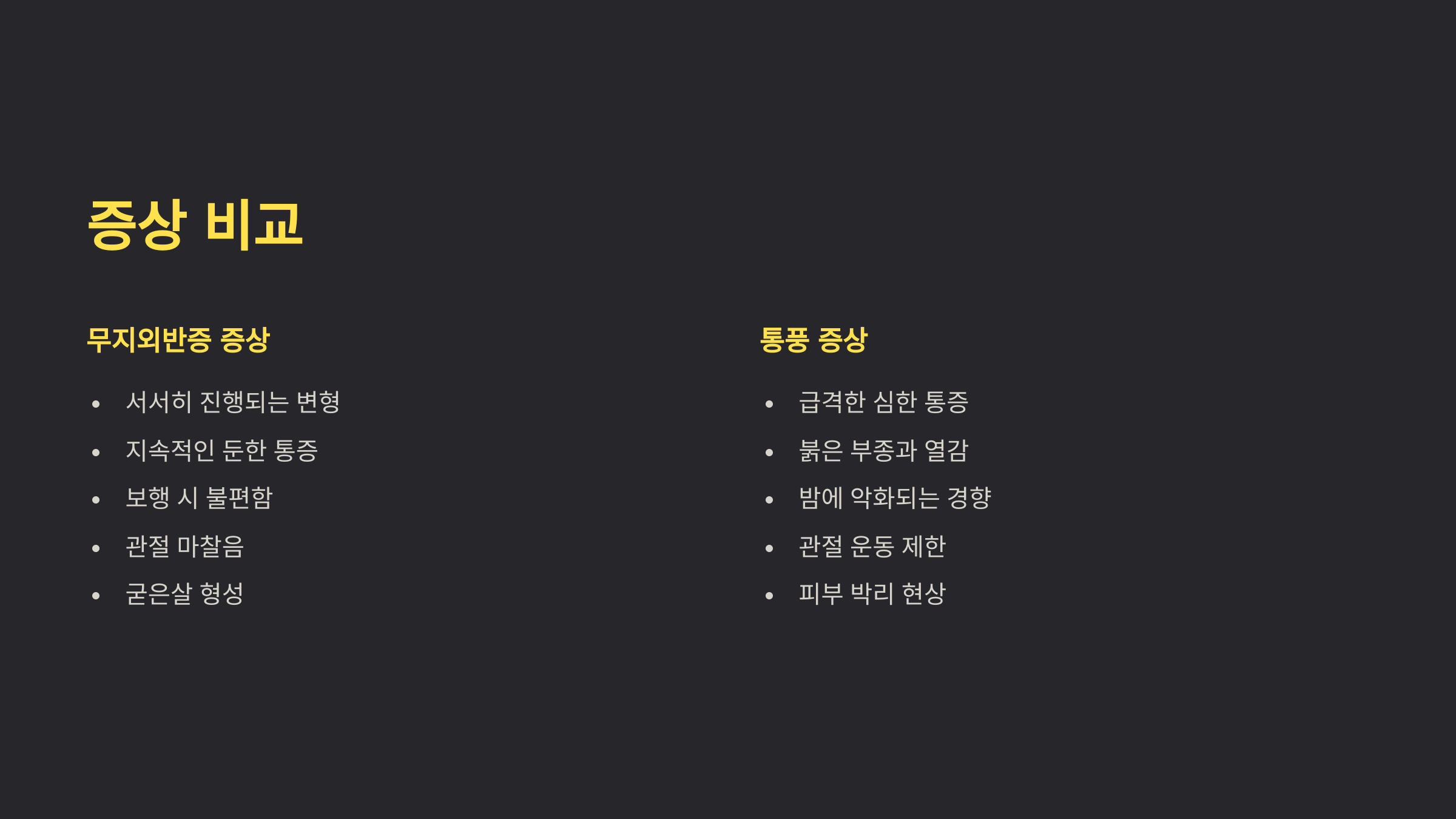 무지외반증과 통풍 모두 발에 나타나는 질환이지만, 증상의 패턴은 완전히 달라요. 특히 초기에는 헷갈릴 수 있어서, 정확히 비교해보는 게 중요해요. 가장 큰 차이는 증상이 서서히 나타나느냐, 갑자기 나타나느냐예요.
