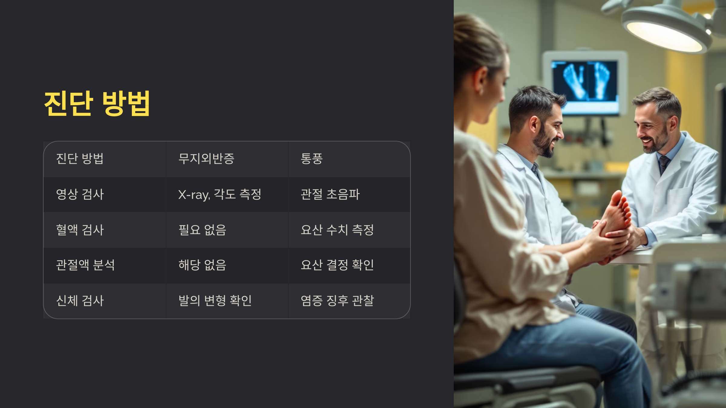 결론적으로, 무지외반증은 구조적 영상 진단, 통풍은 생화학적 혈액 진단이 핵심이에요. 접근 방식 자체가 다르기 때문에, 병원에서 정확한 진단 루트를 따르는 것이 가장 중요하답니다.
