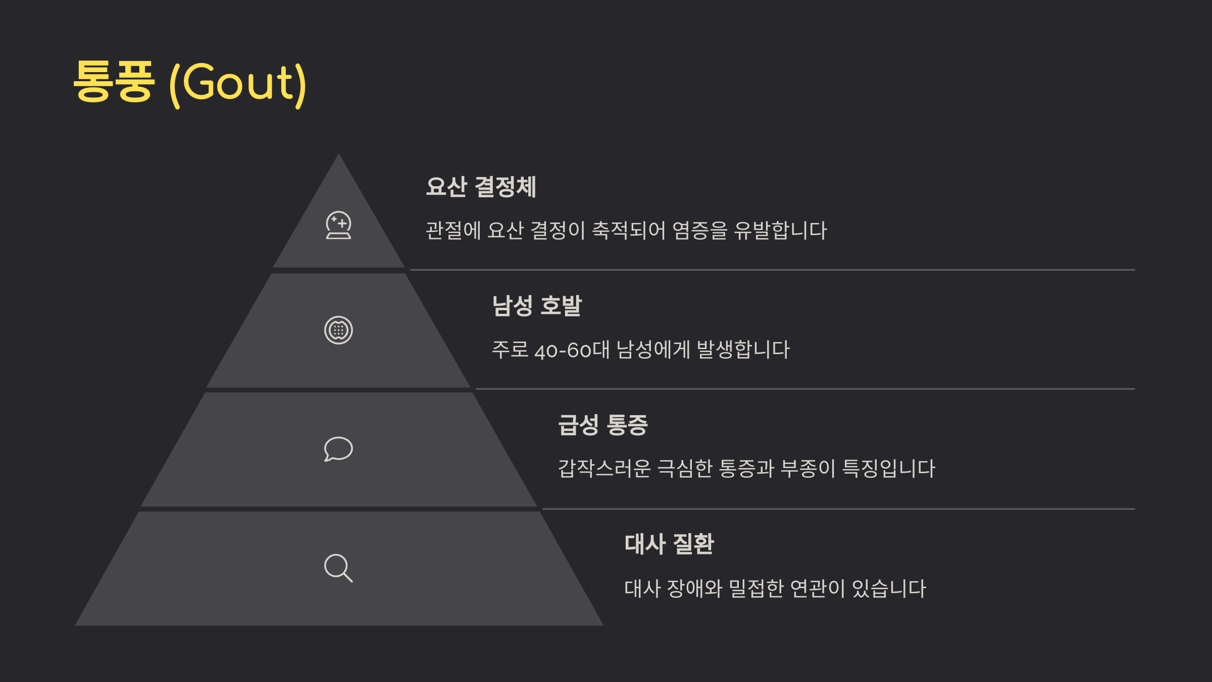 특히 비만, 당뇨, 고혈압, 고지혈증을 가진 사람에게 더 흔하게 나타나요. 신체 내에서 요산이 제대로 조절되지 않으면, 혈관을 타고 돌아다니던 요산이 관절에 침착돼 심각한 염증을 유발하죠.